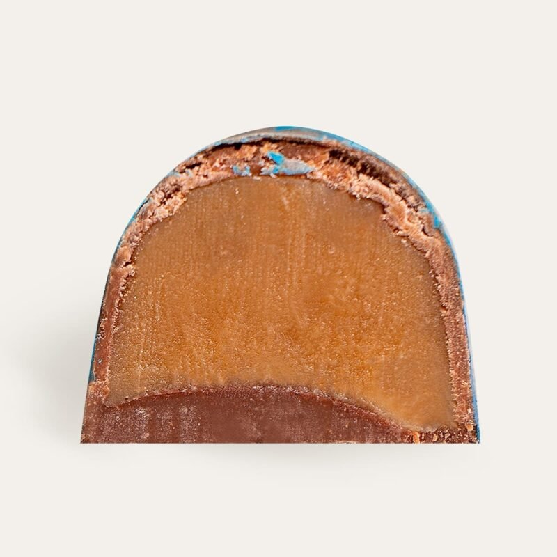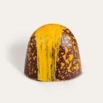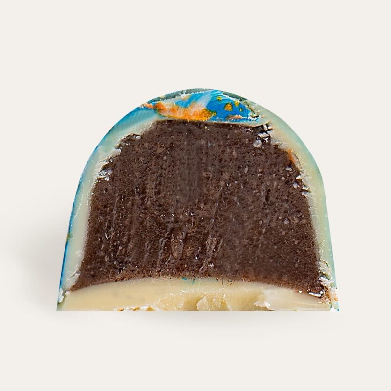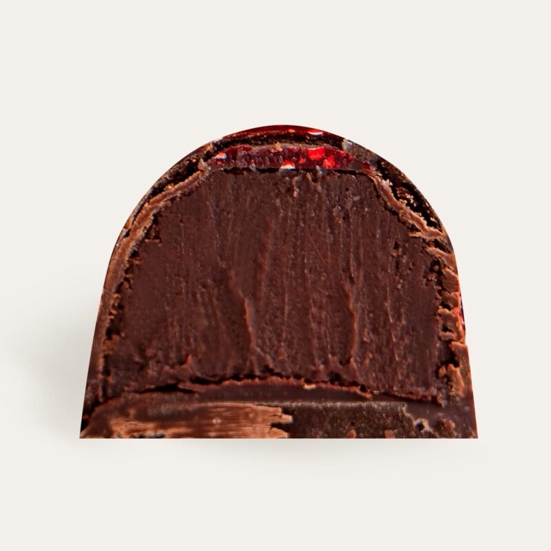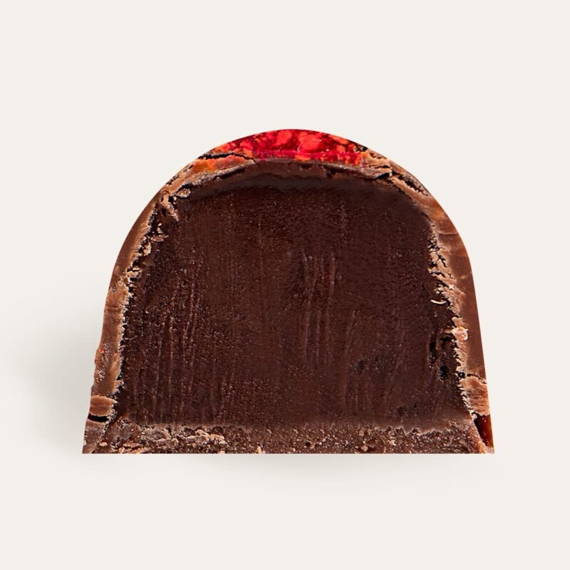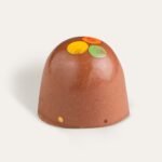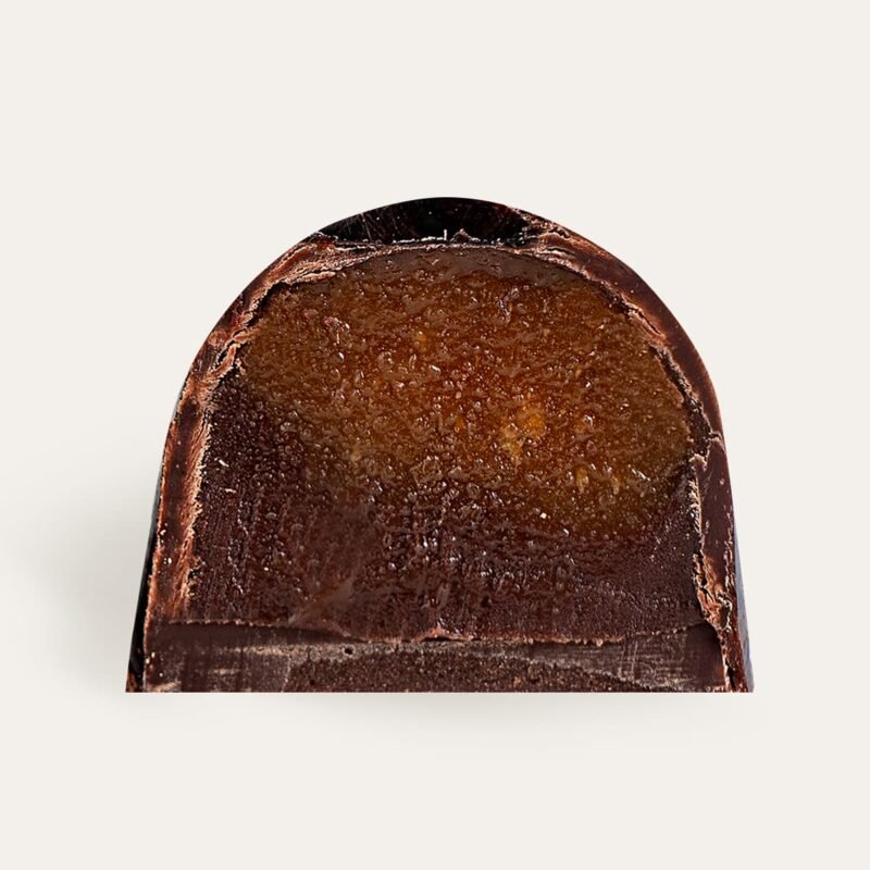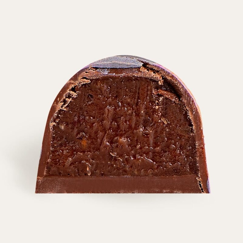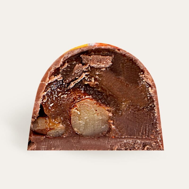Casco de chocolate de leche 34%, relleno de ganache de leche con pulpa de maracuyá.