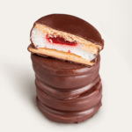 | Base de una galleta de vainilla, con mermelada de frambuesa y malvavisco, cubierto de chocolate semi amargo 58%. |