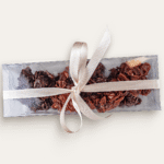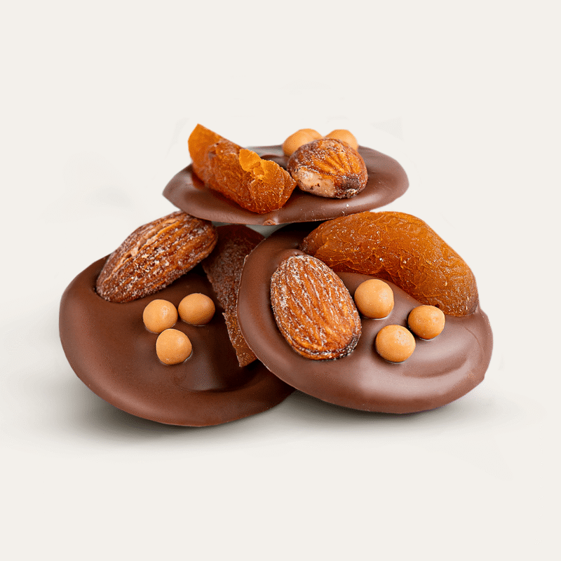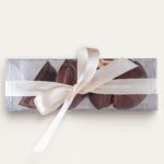 4 Piezas de coco bite: Medallón de ganache de chocolate blanco con coco tostado, cubierto de chocolate semi amargo 58%.