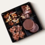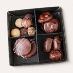 Caja de regalo con: 1 tortuguita de nuez amber + 1 tortuguita de nuez leche + 1 tortuguita de nuez semi amargo + 2 alfajores + 2 bombonetes + 4 enjambre de chocolate semi con cereal de maíz.